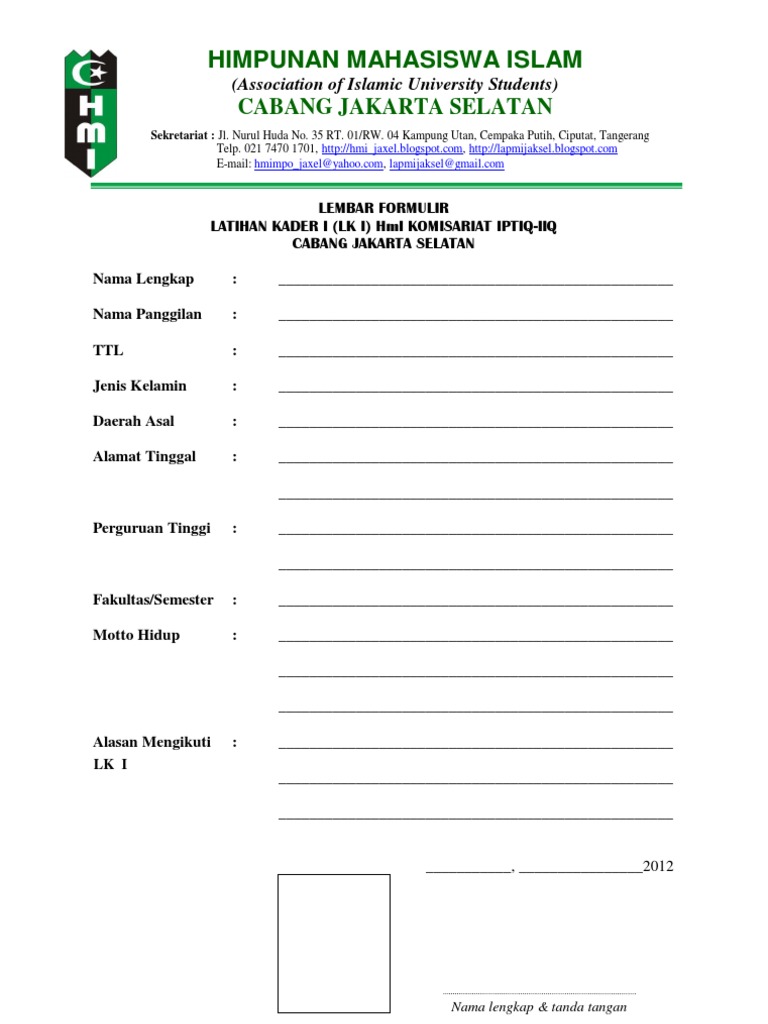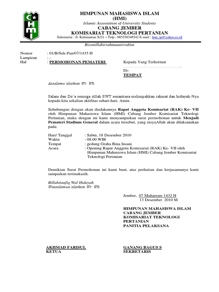 Persyaratan pengajuan surat izin HMI adalah sebagai berikut: